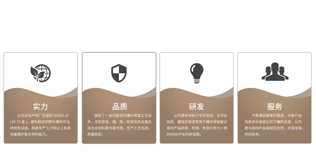 - 安徽弘雷金屬復(fù)合材料科技有限公司成立于2013年5月,坐落于宣紙之鄉(xiāng)—安徽省宣城市,專業(yè)從事各類金屬爆炸復(fù)合材料研發(fā)、生產(chǎn)、銷售和咨詢。注冊(cè)資本伍仟萬元,自有產(chǎn)權(quán)廠區(qū)6萬余平方米(約90畝),建有自有產(chǎn)權(quán)的野外爆炸作業(yè)場地及設(shè)施,具備年產(chǎn)四萬噸以上能力。...